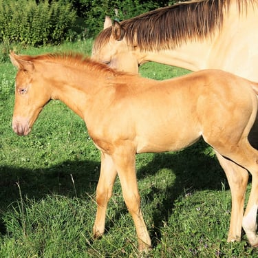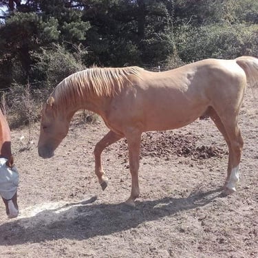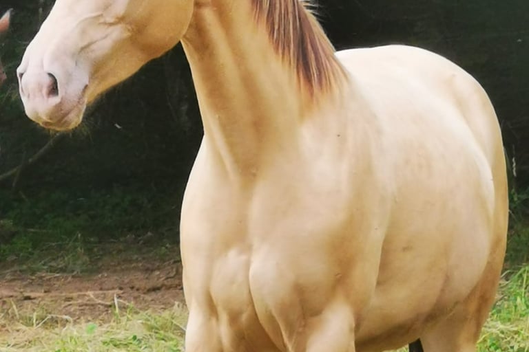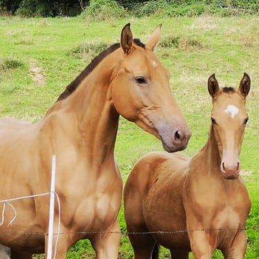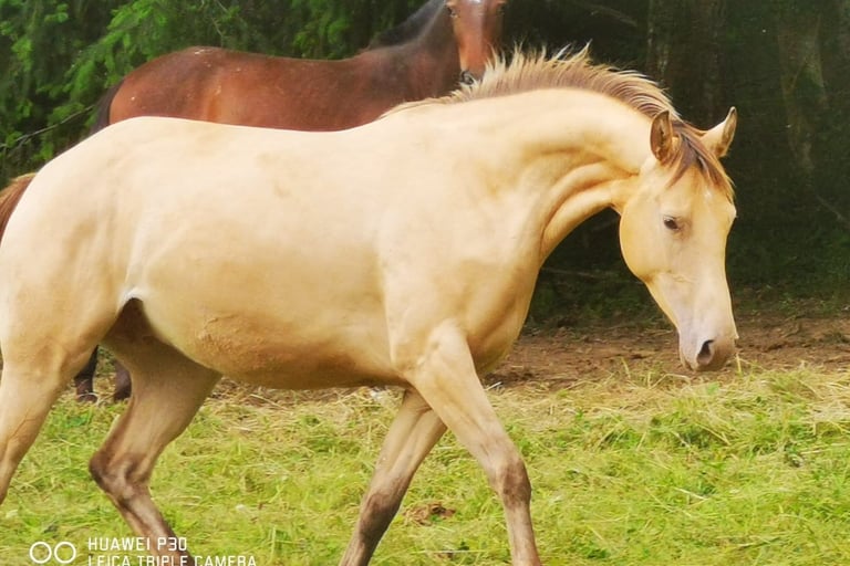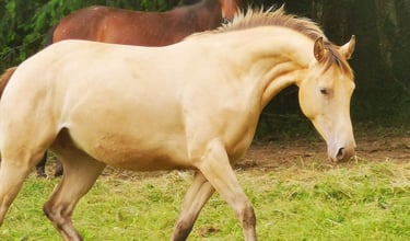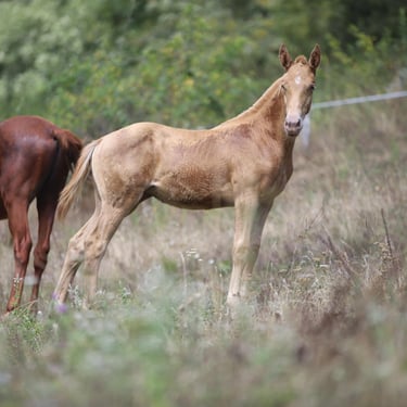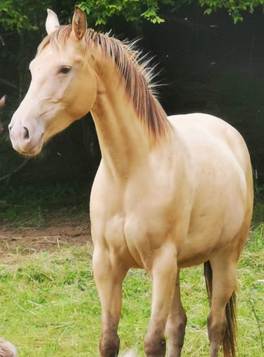 Indochine nous rejoint en mai 2025 pour compléter notre cheptel de juments champagnes. C'est une vraie chance de pouvoir l'accueillir au sein de l'élevage ! Elle est la fille d'un étalon cheval de selle champagne, issu d'un croisement arabo/hispanique/quarter et d'une mère Selle-Française, Lune de Miel fille de Prince d'Anzex AA (né en 1981, très vieille souche Anglo-Arabe).