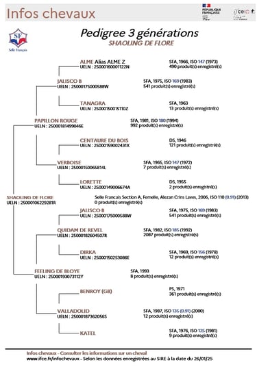 Shaoling est une jument née en 2006, fille directe de Papillon Rouge, étalon performeur et chef de race reconnu, et d'une mère par Quidam de Revel, Shaoling a elle-même tourné sur 130, avec un ISO 110